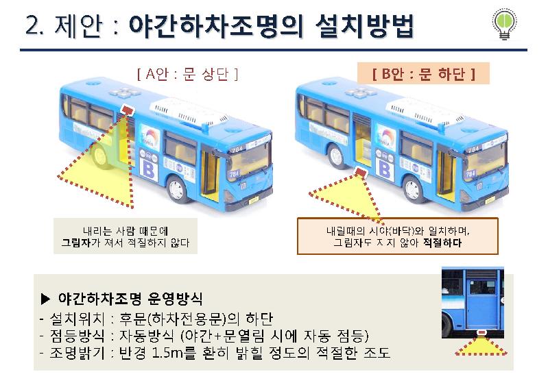또 금상에는 야간에 버스에서 내릴 때 안전한 하차를 돕기 위해 뒷문 아랫부분에 조명을 부착하는 아이디어, 빅데이터를 분석해 혼잡구간에 환승전용․급행버스를 투입하는 아이디어가 선정됐다.