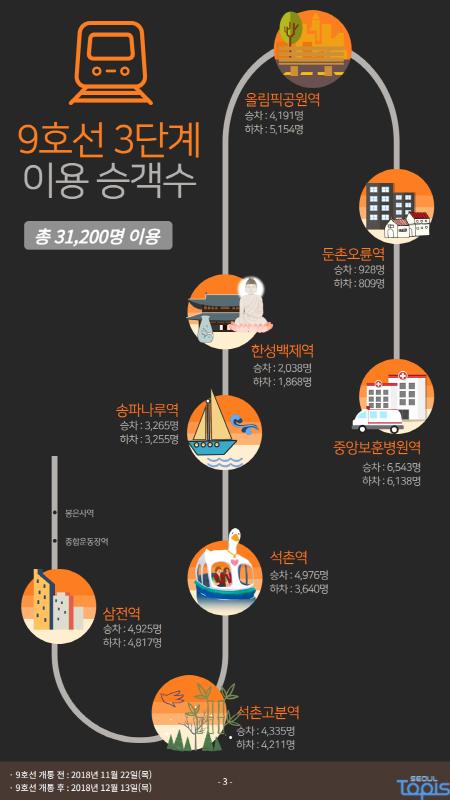 9호선 3단계 구간 개통으로 삼전역부터 중앙보훈병원까지 8개 역사가 신설됐고, 이들 8개 역의 승차인원은 일평균 301백명으로 집계됐다. 종점인 중앙보훈병원역의 탑승객이 가장 많았고, 8호선과 환승 가능한 석촌역이 뒤를 이었다.