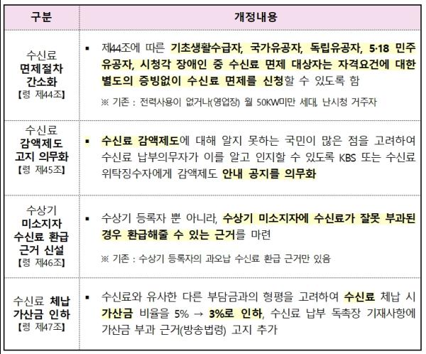 이에 따라 이르면 올 6월부터 수신료를 체납했을 때 가산금이 체납액의 5%에서 3%로 낮아지고 수신료를 먼저내면 6개월 당 한달분의 반액을 할인해주는 선납 감액제도 안내가 의무화되며, 별도 증빙 없이 수신료를 면제받을 수 있는 대상이 확대된다.