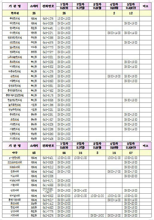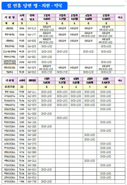 통영시(시장 김동진)는 설 연휴기간 중 시민과 귀성객들이 의료기관 및 약국 이용에 불편이 없도록 당직 병의원 및 당번약국을 지정 운영한다.