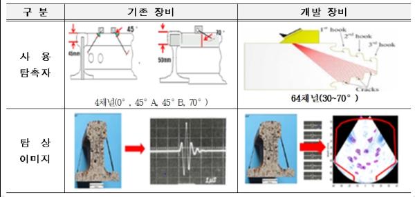 이번에 개발된 ‘초음파 레일탐상장비’는 병원에서 초음파를 이용해 태아나 몸속 상태를 검사하는 것처럼 철도레일의 균열이나 손상의 크기, 위치, 방향 등을 초음파를 이용해 실시간으로 확인하는 장비로서, 해외 유사장비 대비 검측정확도가 50% 이상 높아졌고 그간 검측이 불가능했던 수직균열도 찾아낼 수 있어, 레일탐상 기술을 획기적으로 향상시켰다는 게 한국철도공사 관계자의 설명이다.