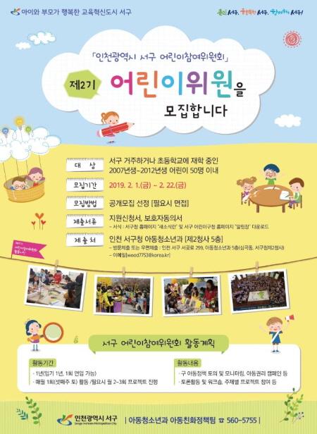 인천 서구가 ‘서구어린이참여위원회 제2기 어린이참여위원’을 오는 22일까지 모집한다고 밝혔다.