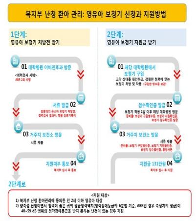 이에 고양시 보건소는 선천성 난청 환아 중에 청각장애를 인정받지 않은 영유아에게 보청기를 지원한다. 지원대상은 기준중위소득 180% 이하 가구, 만 2세 이하 영유아다. 대학병원급 이비인후과에서 정밀검사 결과 양측성 난청이며, 청력이 좋은 귀의 평균청력역치가 40~59dB 범위의 청각장애등급을 받지 않은 경우 지원 가능하다.