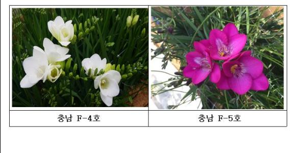이번에 보호출원 예정인 충남 F-4호는 흰색바탕의 홑꽃으로 프리지어 고유의 향기가 있다. 줄기가 굵고 길며 꽃수도 많아 꽃다발 뿐만 아니라 백색 부케용으로도 사용이 가능하다.
