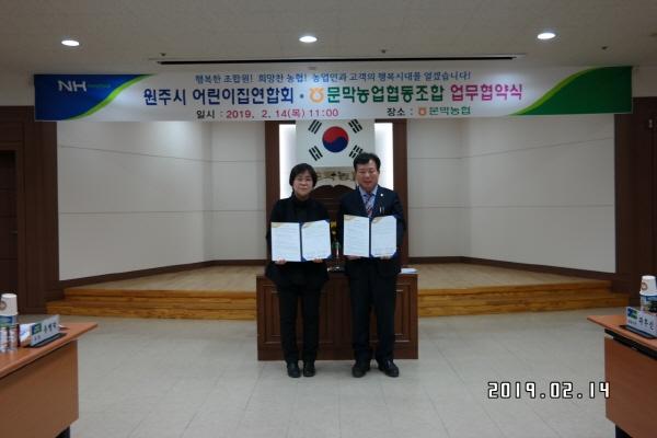 원주시 어린이집 연합회와 문막농업협동조합은 지난 14일 오전 11시 문막농협 하나로마트에서 어린이집 우수농산물 급식 지원 및 농가소득 증대를 위한 업무협약을 체결했다.
