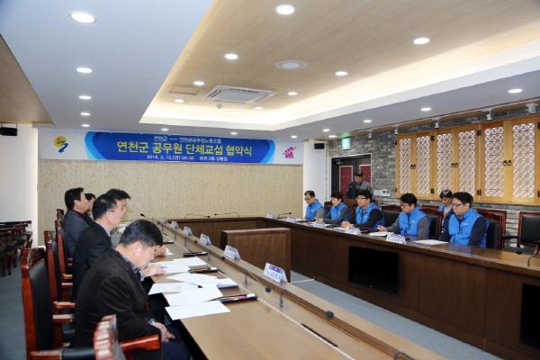연천군은 15일 군청 상황실에서 김광철 연천군수와 이성철 연천군공무원노동조합 위원장 등 노사위원 10여 명이 참여한 가운데 근무환경 개선 등을 담은 129조문 286항목의 단체협약 조인식을 가졌다.