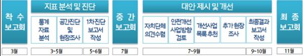 먼저, 해당 지자체의 사망원인통계 심층 분석, 현장조사 및 3차원 공간진단 등을 통해 지역별 취약요인 및 원인을 진단·분석하고, 이어서 지표분석 결과를 토대로 자치단체와 함께 사망자 감축 방향 설정, 개선사업 유형 및 최적화된 세부사업 내용 등을 제시한다.