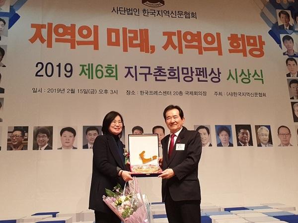 경기도의회 김인순 의원은 지난 15일 한국프레스센터에서 개최된 전국지역 신문협회 주관 ‘2019년 지구촌희망펜 상’ 시상식에서 의정대상을 수상했다.