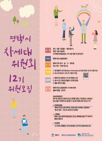 평택시는 관내 학교에 재학 중인 9세부터 24세 청소년을 대상으로 서류심사와 면접심사를 통해 ‘2019년 평택시차세대위원회 12기’ 위원을 모집한다.