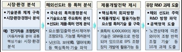 구체적으로, 해외 선도기업 특허 분석을 통해 우리 스타트업들에게 신기술에 관한 다양한 정보를 제공하는 한편, 활용 가능한 특허기술 풀을 구축해 후발주자의 제품개발전략을 지원하고, 유망 R&D 과제도 도출한다.
