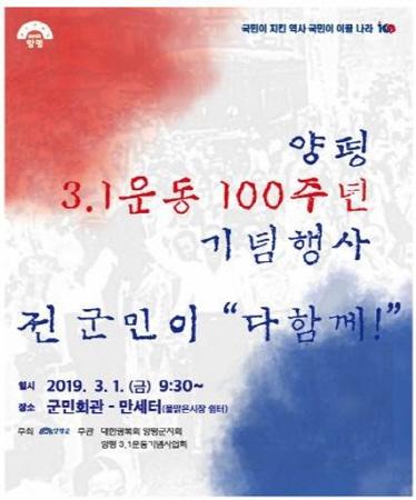 양평군은 3.1운동과 임시정부 수립 100주년을 맞아 선열들의 독립운동과 양평이 가지고 있는 역사적 의미를 되새기는 다양한 기념행사를 대대적으로 개최한다고 밝혔다.