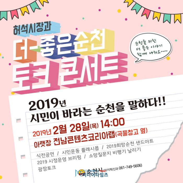 이번 광장토론은‘시민이 바라는 순천을 말해요’라는 주제로 2019년 시정 방향을 허석 시장의 생생한 목소리로 직접 듣고 각계각층의 다양한 시민들의 질의응답과 토론 형식으로 진행된다.