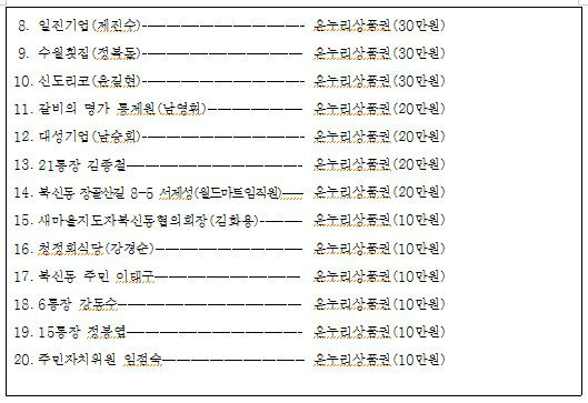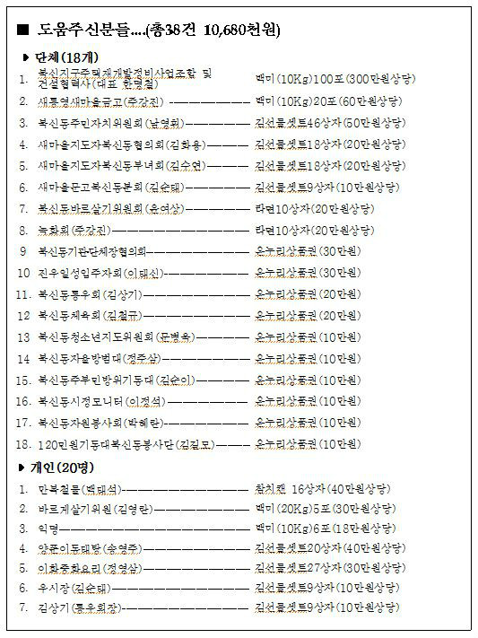 기탁한 성품은 상품권, 백미, 김 등 환가액 10,680천원 상당으로, 기탁된 물품을 지역 내 소외되거나 경제적 어려움을 겪고 있는 독거노인, 한부모, 다자녀 가정 등 주변의 도움이 절실한 478세대에 전달하여 풍성한 설 명절을 보낼 수 있도록 하였으며, 또한 관내 경로당 4곳을 방문하여 어르신들에게 위문품을 전달해 드리며 가족들과 따뜻한 명절을 보내기 바란다는 인사와 함께 어르신들이 경로당 이용에 불편함이 없는지 곳곳을 살폈다.