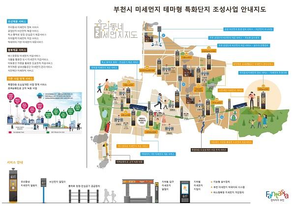 촘촘하고 신뢰성 있는 정보제공을 위한 우리동네 미세먼지 알림이 서비스 부천시 현안인 삼정동 레미콘 공업단지 비산먼지 해결 서비스 차량 배출 오염물질과 폭염으로부터 학생보호를 위한 통학로 청정 안심공기 제공서비스 과학적 미세먼지 대응체계 지원을 위한 부천시 미세먼지 빅데이터 플랫폼 구축 등 4개 사업은 국·시비 매칭을 통해 추진하고 7호선 지하철역 미세먼지 저감서비스 사업은 다른 사업들과 연계해 자체재원으로 추진함으로써 길주로변을 따라 테마형 미세먼지 안심 특화단지를 조성할 계획이다.