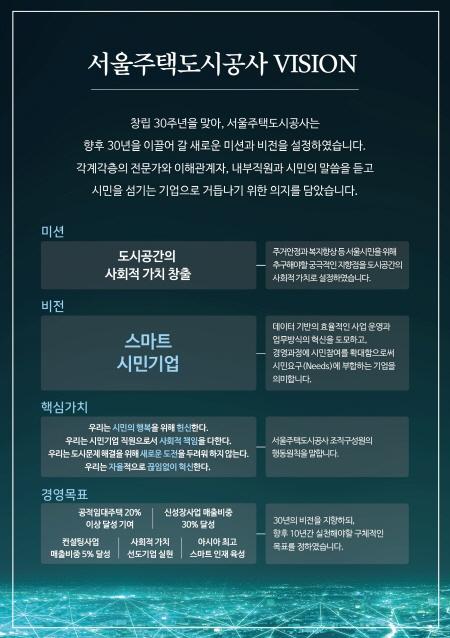 서울주택도시공사는 ‘도시공간의 사회적가치 창출을 위한’‘스마트 시민기업’으로서 새로운 비전을 선포하며 서울시의 도시 공간에서 발생하는 문제를 적극적으로 해결하고 시민기업으로서 거듭날 것을 대내외에 공표했다.
