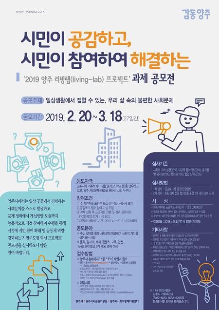 양주시는 오는 3월 18일까지 사회적경제지원센터, 양주시설관리공단과 함께 ‘2019 양주 리빙랩 프로젝트’ 과제 공모전을 개최한다고 밝혔다.