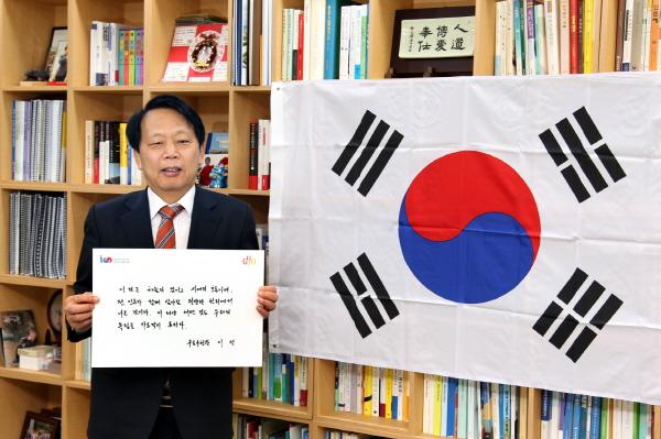 이성 구로구청장이 20일 구청 집무실에서 3·1 독립선언서 일부 구절을 적은 종이를 들어 올리며 활짝 웃었다.