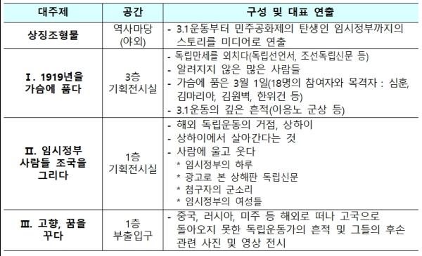 3·1운동과 대한민국임시정부 수립은 오늘의 대한민국을 만든 민족사의 획기적 사건이지만, 아직까지도 잘 알려지지 않은 부분들을 재조명하기 위해 기획한 특별 전시로 총 3부로 구성됐다..