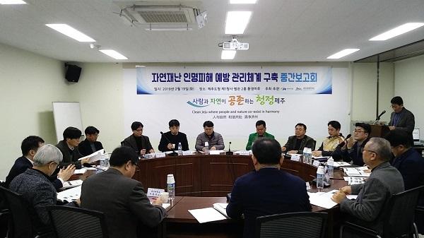 제주특별자치도는 지난 19일 오후 4시, 제주도청별관 2층 환경마루에서 ‘자연재난 인명피해 예방 관리체계 구축 중간보고회’를 개최하고, 용역추진상황 보고와 관련 분야 전문가 및 부서로부터 의견을 수렴했다.
