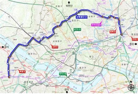 이번에 발표된 강북횡단선은 청량리역~국민대~홍제~DMC~목동역까지 연결되는 총 연장 25.72Km, 정거장 19개소 규모로 지역균형발전을 목표로 한다.