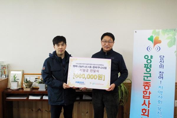 이 날 코레일 용문차량사업소는 행복장바구니사업을 위한 지원금 600,000원을 양평군종합사회복지관에 전달했으며, 지원금은 지역 내 홀몸어르신에게 필요한 물품을 지원하는 행복장바구니 사업에 활용할 예정이다.