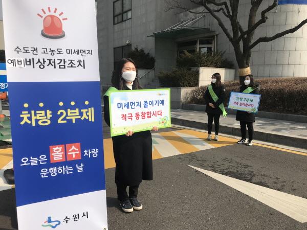 수원시는 지난 20일과 21일 양일간 수도권에 처음 실시된 미세먼지 예비저감조치에 따라 ‘행정·공공기관 차량2부제’ 캠페인을 전개하고, 시민 참여를 독려했다.