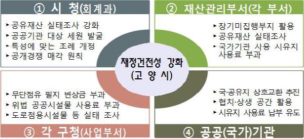 공유재산의 종합적이고 효율적인 운영·관리 방안으로는 공유재산 통합 실태조사 강화, 공유재산 매각 시 공개경쟁 원칙, 고양시 특성에 맞는 공유재산 조례 개정, 공공기관 점용료 부과 등 세원 발굴, 장기미집행 사업 부지의 다각적 활용 등이다.