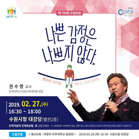 수원시는 오는 27일 오후 4시 30분 시청 대강당에서 ‘나쁜 감정은 나쁘지 않다’를 주제로 104번째 수원포럼을 연다. 권수영 연세대 교수가 강연한다.
