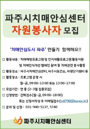 자원봉사를 원하는 시민은 파주시치매안심센터로 전화 신청하면 된다. 자세한 사항은 파주시치매안심센터 및 치매상담콜센터로 문의하면 된다.