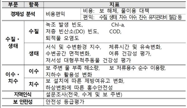 수질은 녹조, 화학적산소요구량, 퇴적물 오염도 등 5개 지표, 생태는 서식 및 수변환경 지수, 어류 건강성, 저서성 대형무척추동물 등 5개 지표로 구성하되, 각각 보 설치 전, 보 설치 후 관리수위 유지 시, 개방 후 시점을 비교해 평가됐다.