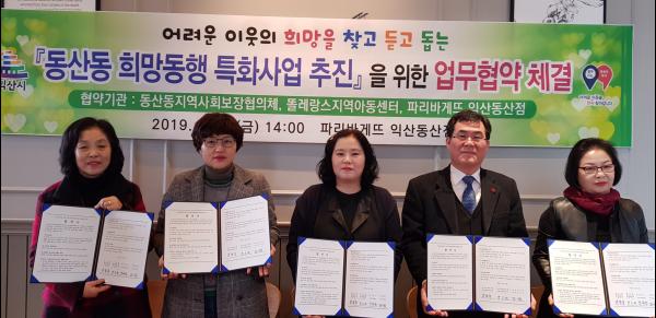 익산시 동산동 지역사회보장협의체는 22일 공동모금회 연합모금사업인 해피투게더 찾아가는 생일상 사업과 저소득 아동 생일케이크 지원사업을 추진하기 위해 똘레랑스지역아동센터 및 파리바게트 익산동산점과 업무협약을 체결했다.