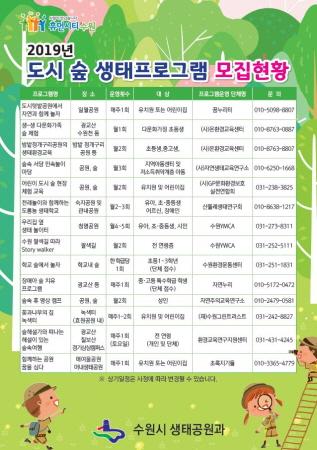프로그램별 모집 인원, 운영 시간 등 자세한 사항 수원시청 홈페이지 ‘수원소식→시정소식’ 게시판에서 ‘2019년 도시숲 생태프로그램 참여자 모집 안내’를 검색해 확인할 수 있다.