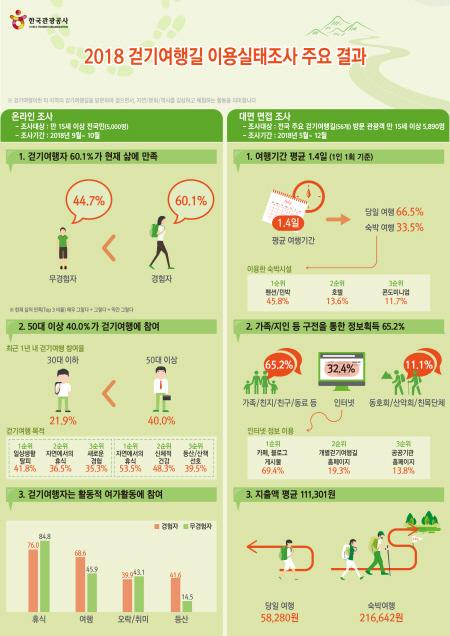 이번 조사는 전국 56개 걷기여행길에서 만 15세 이상의 걷기여행자 5,890명에 대한 대면면접조사와 전 국민 5,000명을 상대로 한 온라인 조사로 실시됐고, 표준오차는 ±1.39%이다. 국내에 소재하는 걷기여행길은 2007년 제주올레, 2008년 지리산둘레길 개장을 시작으로 현재까지 약 550개이며, 걷기여행길 누리집인 ‘두루누비'에 소개되고 있다. ’걷기여행’은 타 지역의 걷기여행길을 방문해 지역의 자연,문화,역사를 감상하고 체험하는 활동으로, 생활체육 걷기와는 구분된다.