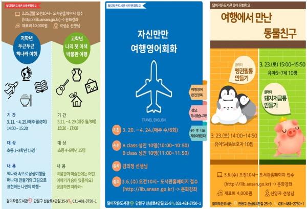 안산시는 여행분야 특화 도서관인 ‘달미작은도서관’ 주관으로 오는 3월 풍성하고 다채로운 여행관련 프로그램을 운영한다고 밝혔다.