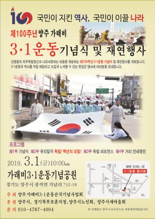 양주시는 오는 3월 1일 10시 광적면 가납리 가래비 3·1운동 기념공원에서 '양주 가래비 3·1운동 100주년 기념식'을 개최한다고 밝혔다.