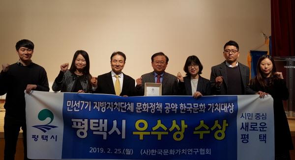 평택시가 지난 25일 문화체육관광부 소속 사단법인 한국문화가치 연구협회가 선정한 ‘제1회 한국문화가치대상’ 민선7기 문화정책 공약분야에 우수상을 수상했다.
