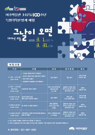 여주시 여주박물관에서는 3.1운동 및 대한민국임시정부 수립 100주년을 기념해 오는 3월 1일부터 8월 18일까지 여주지역의 독립만세운동을 소개하는 특별기획전시를 개최한다. 이와 함께 3월 한 달간 특별전시와 연계해 체험 및 교육프로그램을 통해 시민들과 함께 1919년 3월, 그날의 의미를 되새기려고 한다.
