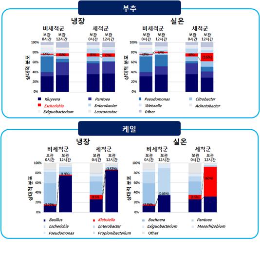 반면 부추·케일 모두 세척하지 않고 실온에 12시간 보관한 경우 식중독균 또는 유해균의 분포 변화가 관찰되지 않았다.
