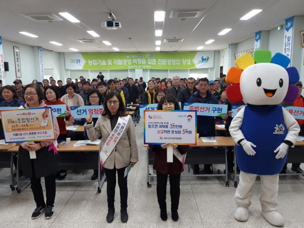 이날 실시된 결의대회는 PLS 사전대응 출하농가 교육에 참석한 관내 지역농협 엽채류 등 재배농가 150여명을 대상으로 선관위 지도계장의 공명선거 안내 영상을 통한 교육이 이루어졌고, 참석자들은 이번 선거가 깨끗하고 아름다운 선거가 되도록 다짐하는 결의대회도 가졌다.