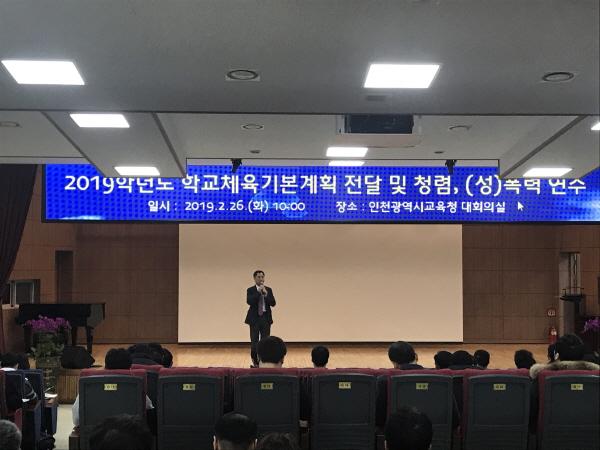 인천광역시교육청은 26일 시교육청 정보센터 대회의실에서 2019학년도 학교체육기본계획 전달 및 청렴, 폭력 연수를 초·중·고등학교 체육업무 담당교사, 운동부 지도교사, 교육지원청 학교체육 업무 담당자들을 대상으로 실시했다.