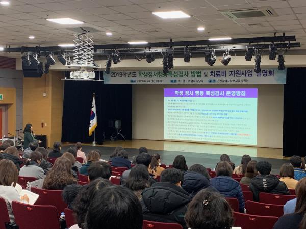 인천광역시남부교육지원청은 26일 관내 초·중·고등학교 학생정서행동 실무 담당자를 대상으로 ‘학생정서행동특성검사 및 치료비 지원사업 설명회’를 가졌다.