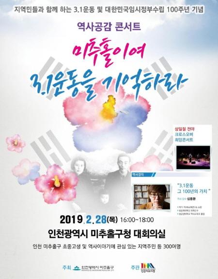 3.1운동 및 대한민국임시정부수립 100주년을 맞아 ‘역사공감 콘서트, 미추홀이여 3.1운동을 기억하라’라는 주제로 진행되는 행사에서는 클래식 공연과 역사 강의가 진행될 예정이다.