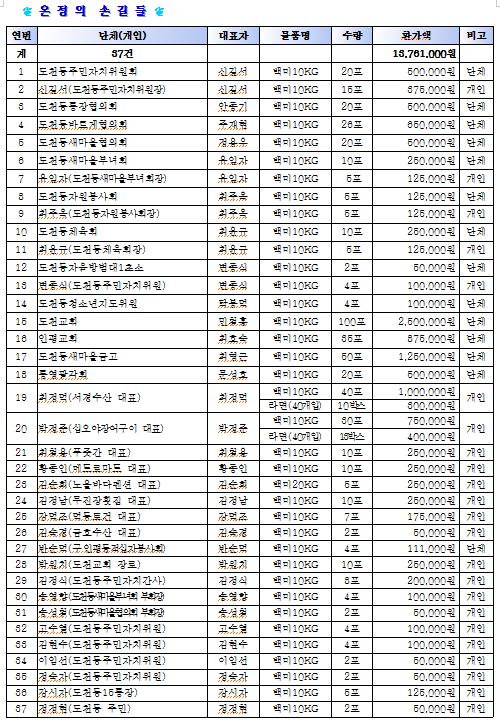 도천동장은 경제적 여건이 어렵고 이웃을 위한 도움의 손길이 아쉬워지는 요즈음 잊지 않고 따뜻한 온정의 손길을 모아주신 자생단체 및 독지가들에게 깊은 감사의 말씀을 전하며 훈훈한 설 명절을 준비했다.