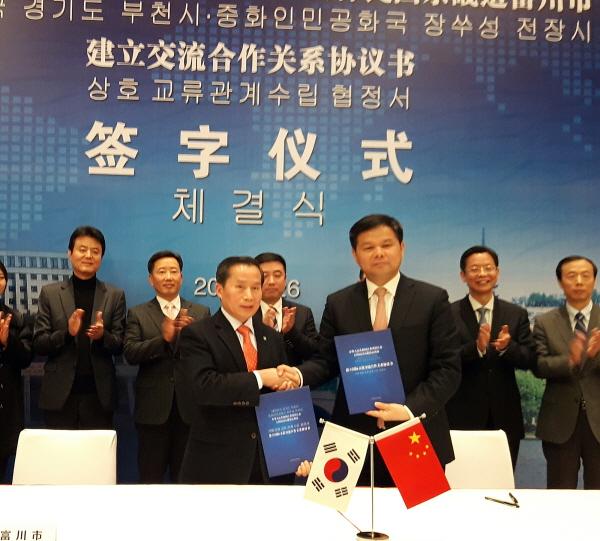 송유면 부천부시장과 천커커 전장부시장은 지난 26일 중국 전장시에서 양 도시 간 ‘펄벅문화교류를 위한 양해각서’를 체결했다.