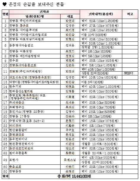 지역 경제가 어려운 여건임에도 관내 많은 독지가 등이 이웃을 위해 백미 542포, 상품권 등 총환가액 18,400천원 상당의 성금품을 정량동 주민센터에 기탁해 주어 기초수급자를 포함해 저소득 한부모가정, 독거 노인세대 등 관내 생활이 어려운 555세대, 경로당(6개소), 무료급식소 등에 전달했다.
