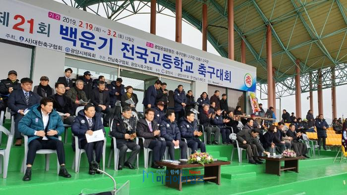 개회식에는 방옥길 부시장과 조병득 대한축구협회 부회장 등 내빈들이 참석하여 전국 35개 고교 선수단에게 격려의 메시지를 전달했다.