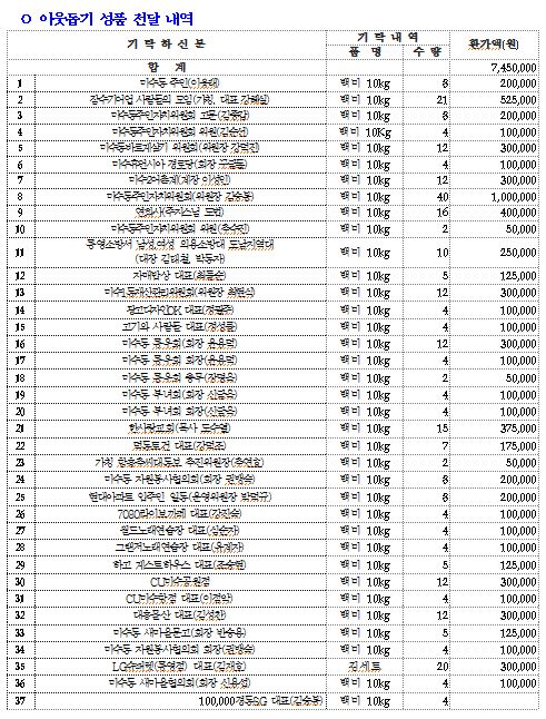 기탁된 쌀, 김 세트 등 위문품 7,555천원 상당을 관내 경로당 10개소, 복지시설 3개소(효은요양원, 통영시공립지역아동센터, 옹달샘), 게이트볼장, 기초생활수급자, 차상위계층 등 어려운 이웃 260여 세대에 전달하고 위문했다.