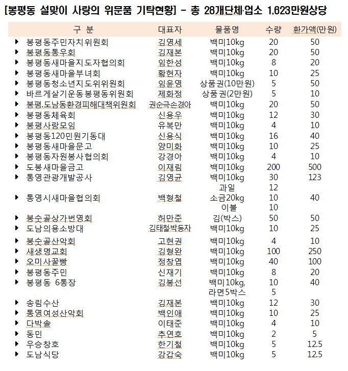 기탁한 위문품은 봉평동 거주 홀로어르신, 보훈가족, 차상위계층, 장애인세대, 다문화가족 등 어려운 이웃 1,080세대(시 위문품 포함)와 관내 경로당과 복지시설에 기탁자의 따뜻한 마음을 소중히 담아 전달했다.