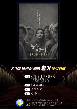 한국청소년복지문화원 안성지부는 오는 28일 안성CGV에서 3.1운동 100주년기념 ‘항거:유관순 이야기’ 문화 활동을 진행한다.