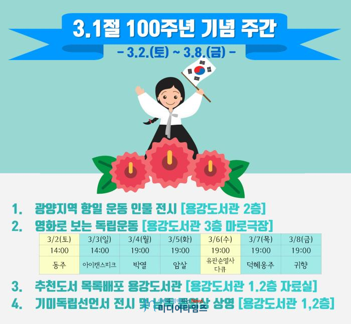 광양시 도서관운영과 김복덕 과장은 “시민 전 연령층의 사랑을 받고 있는 도서관에서 3.1운동 및 임시정부 수립 100주년 기념행사를 추진하는 것은 의미가 크다.”며, “이번 기회에 더 많은 시민들이 용강도서관을 방문해서 함께 선열들의 숭고한 독립정신을 기억하고 그 가치를 기념하면 좋겠다.”고 말했다.